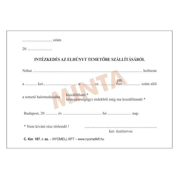 C.KER.187 INTÉZKEDÉS AZ ELHUNYT TEMETŐBE SZÁLLÍTÁSÁRÓL, FEKVŐ, 1 OLDALAS, A/6,