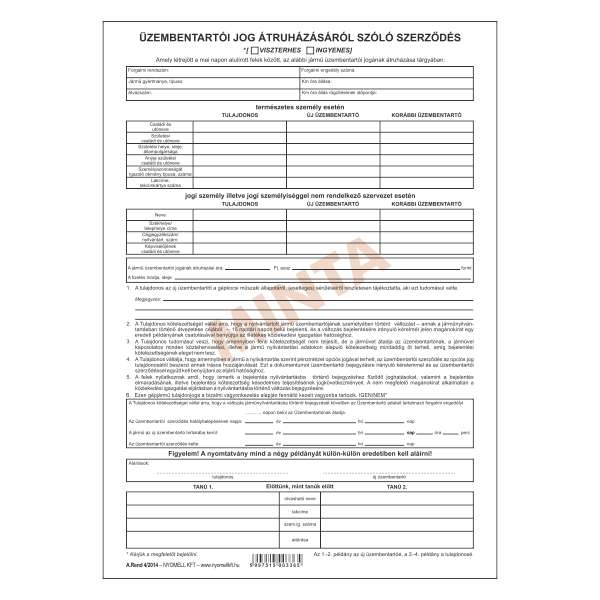 A.REND.4/V/2014 ÜZEMBENTARTÓI JOG ÁTRUHÁZÁSÁRÓL SZÓLÓ SZERZŐDÉS, 4 PÉLDÁNYOS, A/4