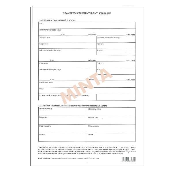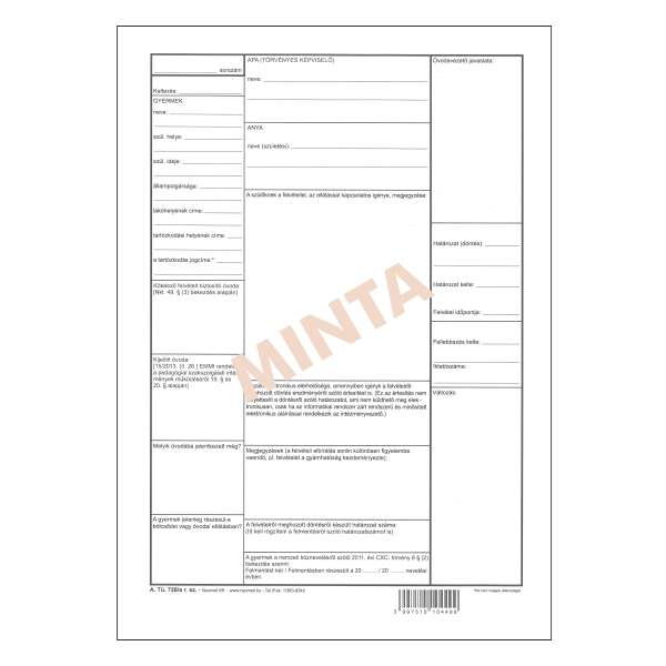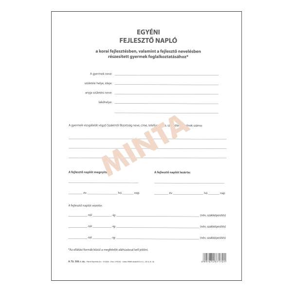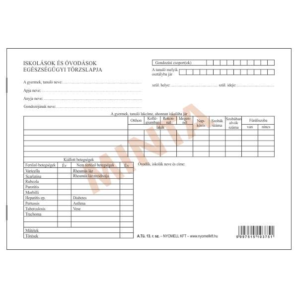 A.TÜ 13 ISKOLÁSOK ÉS ÓVODÁSOK EGÉSZSÉGÜGYI TÖRZSLAPJA, FEKVŐ, 24 OLDAL, A/5