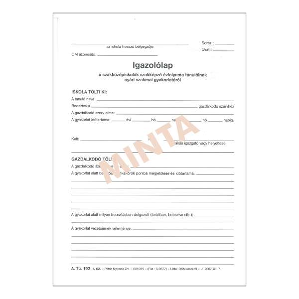 A.TÜ 192 IGAZOLÓ LAP