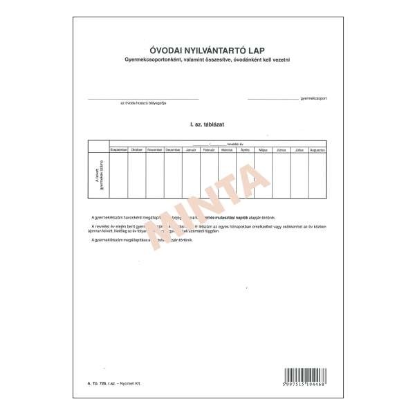 A.TÜ 726 ÓVODAI ÉTK.NYT. LAP, A/4, 1+1 SZÍN