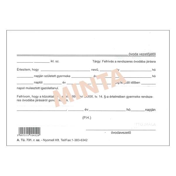 A.TÜ 731 FELH.RENDSZ.ÓVODÁBA JÁRÁSRA