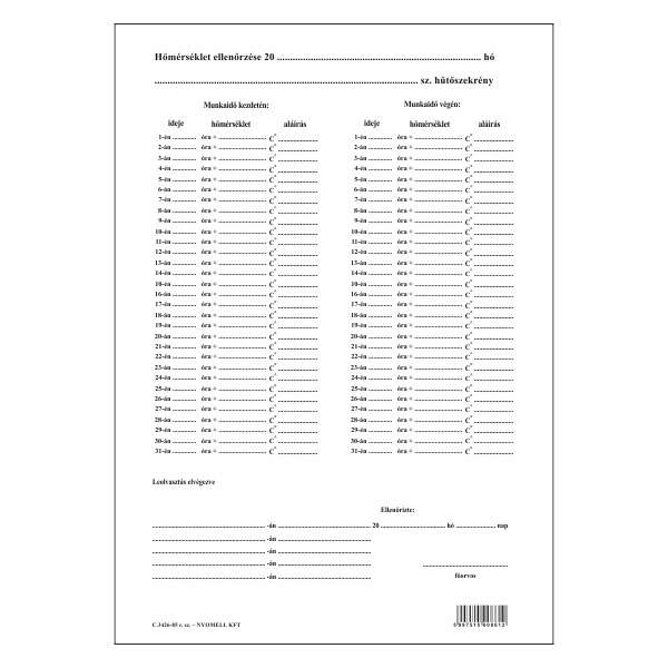 D.E.1000 HŰTŐBERENDEZÉSEK HŐMÉRSÉKLET ELLENŐRZÉSI LAPJA, 70 G/M2 OFSZET, A/4, 2+0 SZÍN
